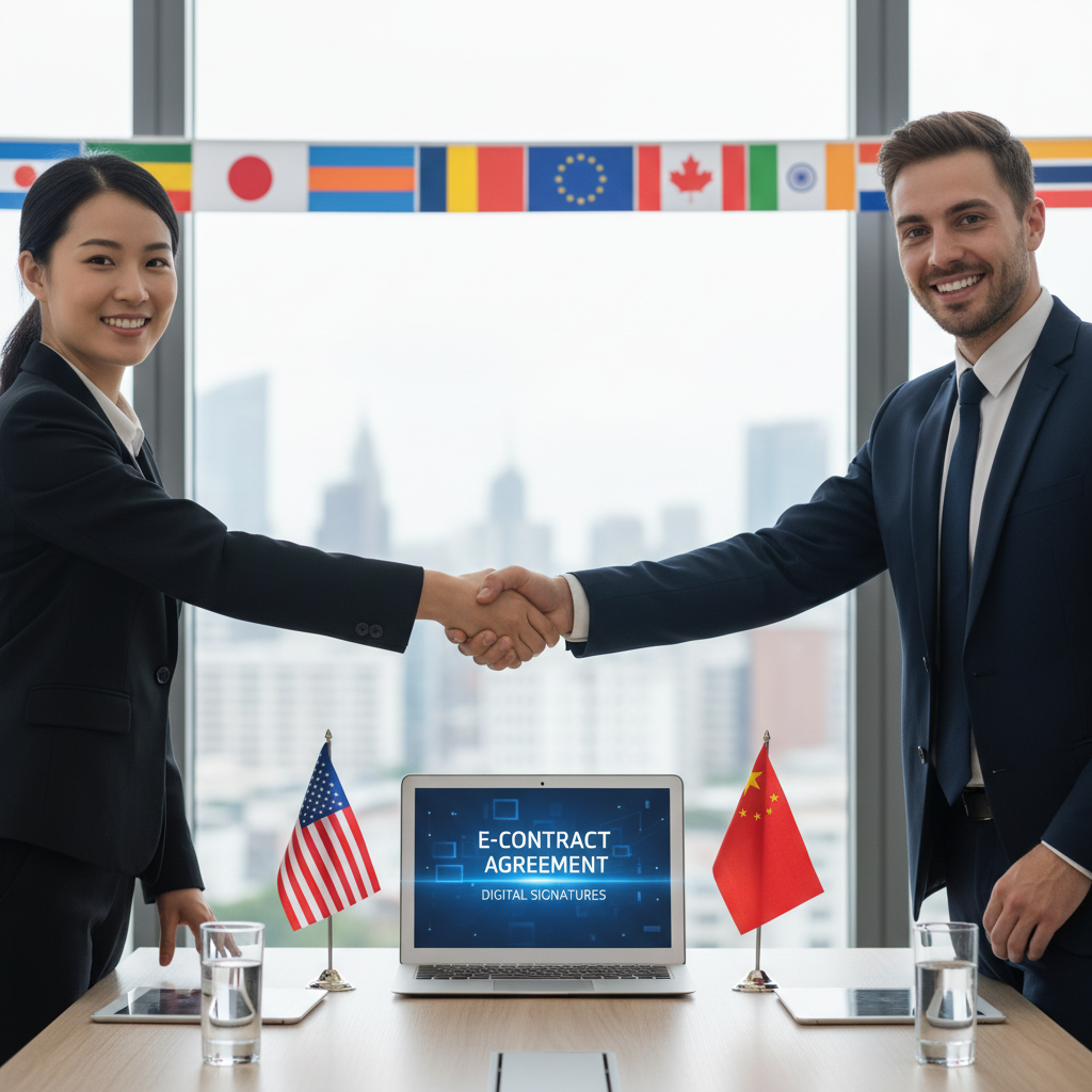 Kontrakt zawierany pomiędzy podmiotami z różnych krajów z wykorzystaniem środków komunikacji elektronicznej (np. e-mail, platformy B2B, e-podpis).