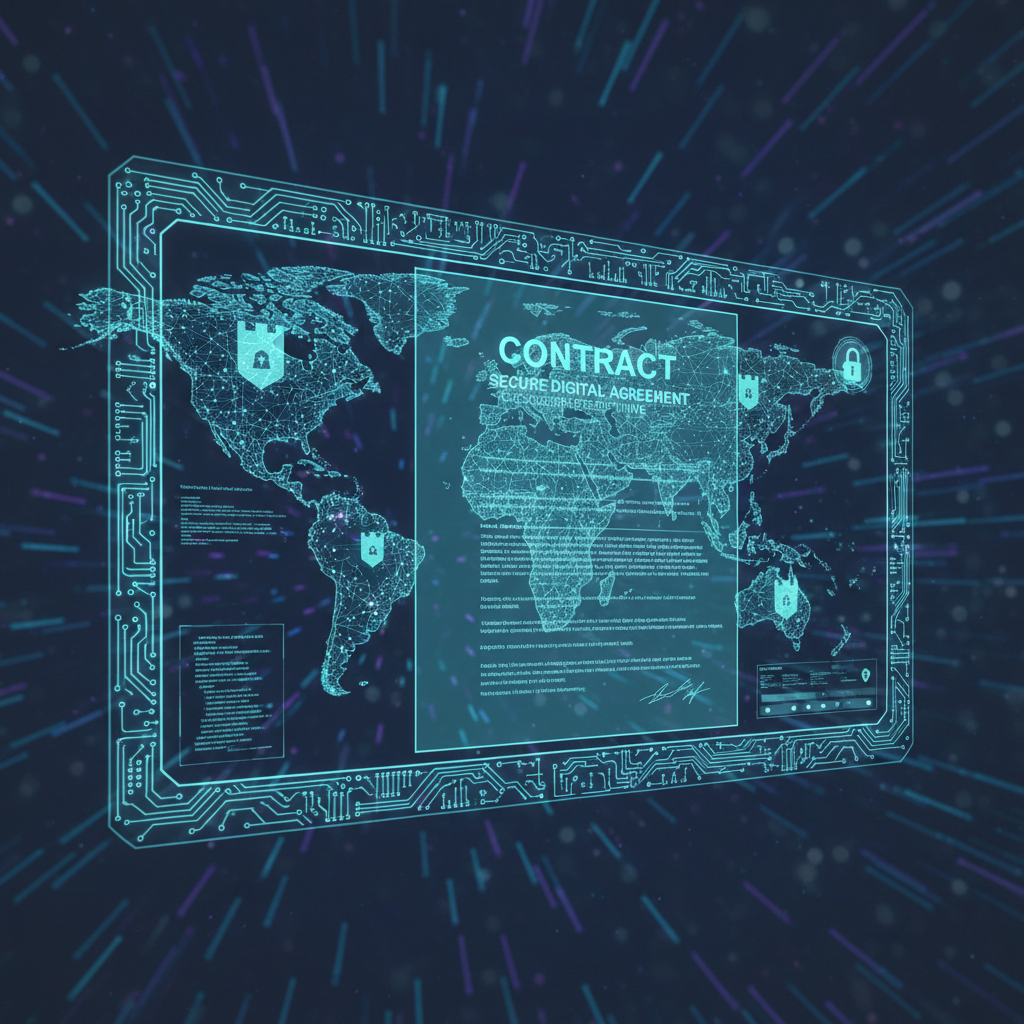 Dokument zawierany elektronicznie między stronami z różnych krajów – wymaga precyzyjnego określenia prawa i jurysdykcji oraz uwzględnienia zabezpieczeń cyfrowych.
